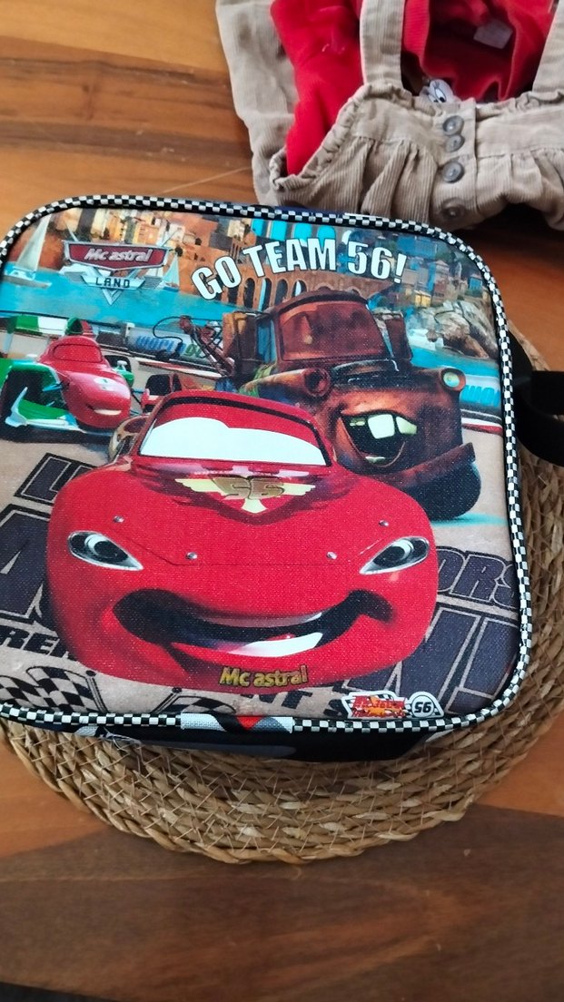 Canlı kırmızı renkte, çizgi film araba karakterleri ve bulunan renkli çocuk beslenme çantasıdır. Kenarları kareli desenlidir.