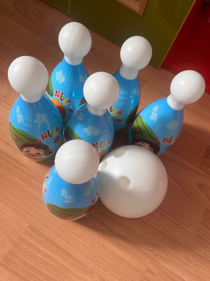 Altı renkli ve desenli çocuğa özel bowling pimi ile beyaz bowling topundan oluşan set.