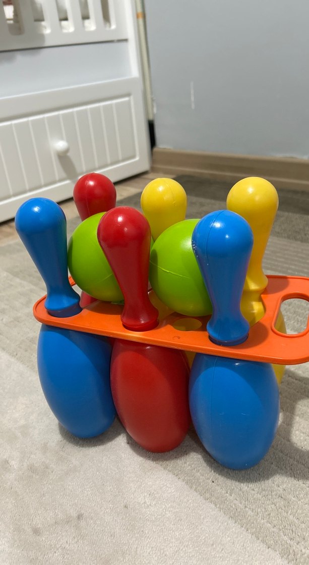 Renkli çocuk bowling seti, canlı renklerde toplar ve pinler içerir, iç mekanda oyun için uygundur.
