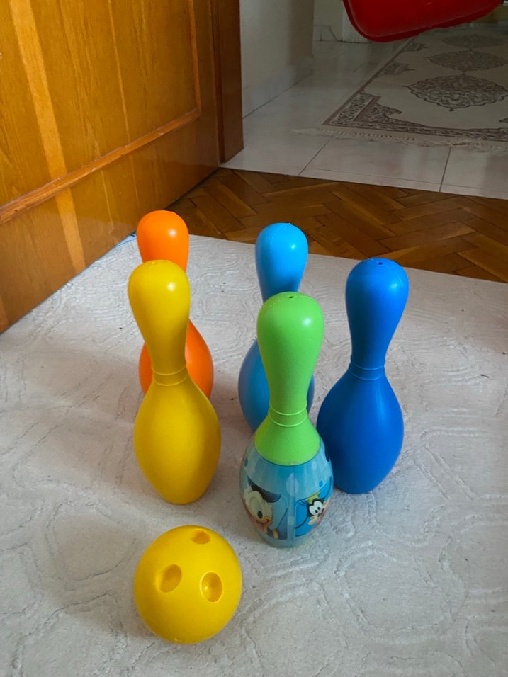 Altı renkli top ve beş iğneden oluşan çocuk bowling seti, kapalı oyun için uygundur. İğneler sarı, turuncu, yeşil ve mavi renklidir.
