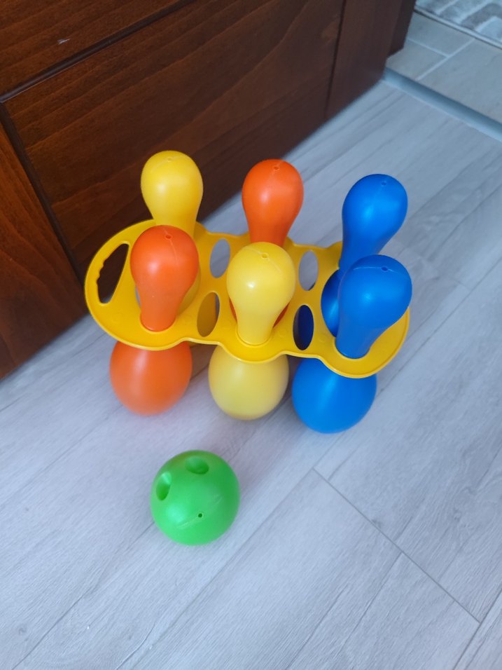 Altı renkli top ve yeşil top içeren çocuklar için renkli bowling seti, ev içi oyunlar için uygundur.