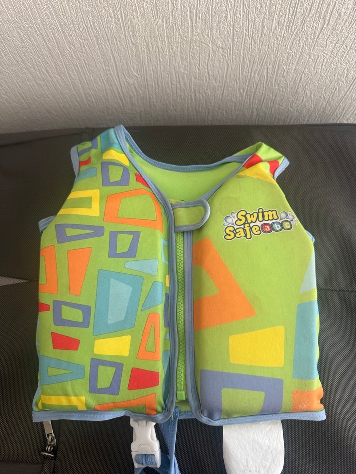 Önde fermuarlı ve güvenlik tokalı, geometrik desenli renkli çocuk can yeleği Swimo logosu ile. Havuz ve plaj için uygun. ♂️iç kısmında küçük bir kumaş yanığı var.ama kullanıma engel değil.son fotoda görünüyor