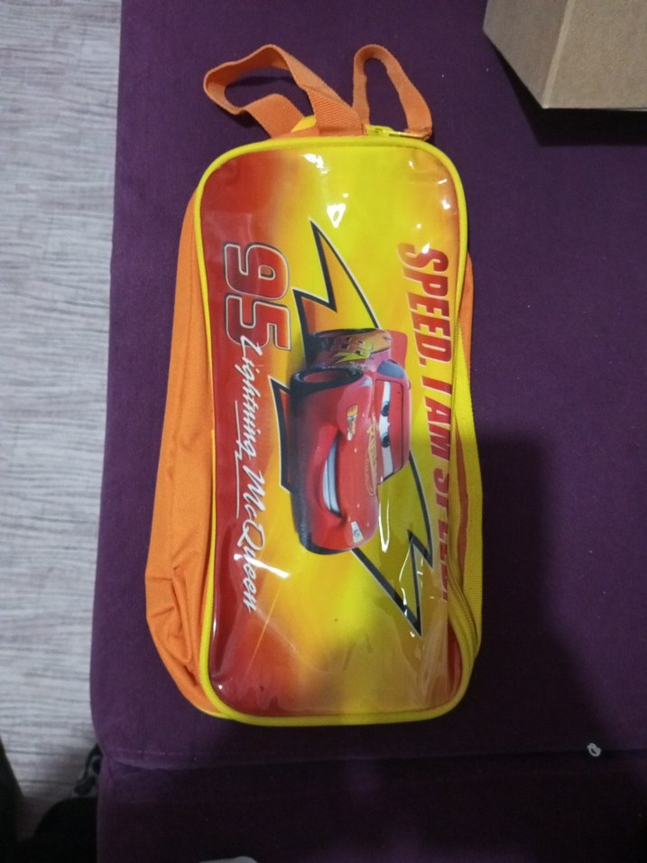 Canlı renklerde, ayarlanabilir turuncu askılı çocuk okul çantası. Üzerinde 'SPEED.1AMS' yazısı ve araba görseli bulunur. Çok amaçlı kullanılır.
