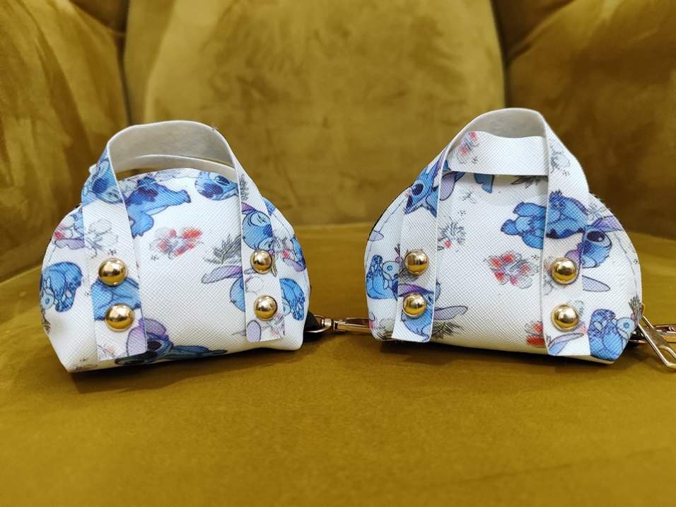 Beyaz sentetik kumaştan, renkli Stitch baskılı ve tokalı detaylara sahip çocuk çantası, çanta kenarına asılmalık. Adet fiyatıdır.