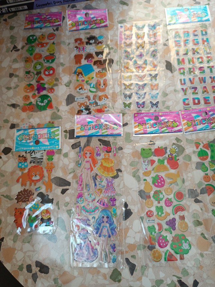 Hayvanlar, kelebekler, harfler ve çizgi film karakterleri içeren renkli çocuk çıkartmaları seti.