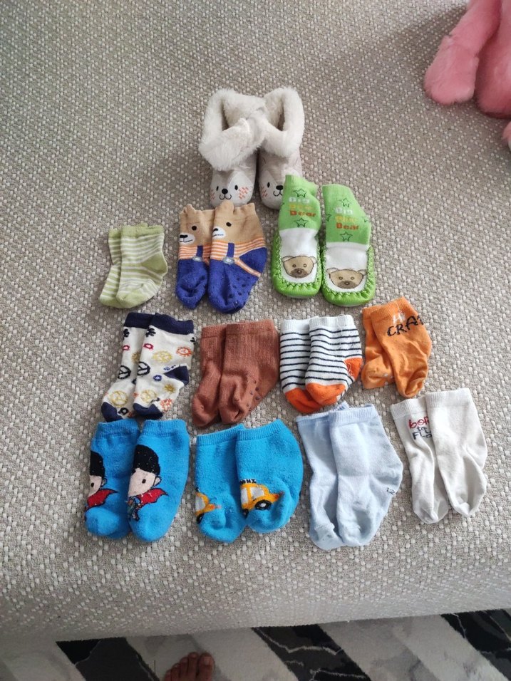 Çeşitli desenlerde, yumuşak kumaştan yapılmış renkli çocuk çorapları seti. 6-9 aya uygundur, tüylenme mevcut . 1 tane ev ayakkabısı (20) bir tane kalın tabanlı (18-19 )