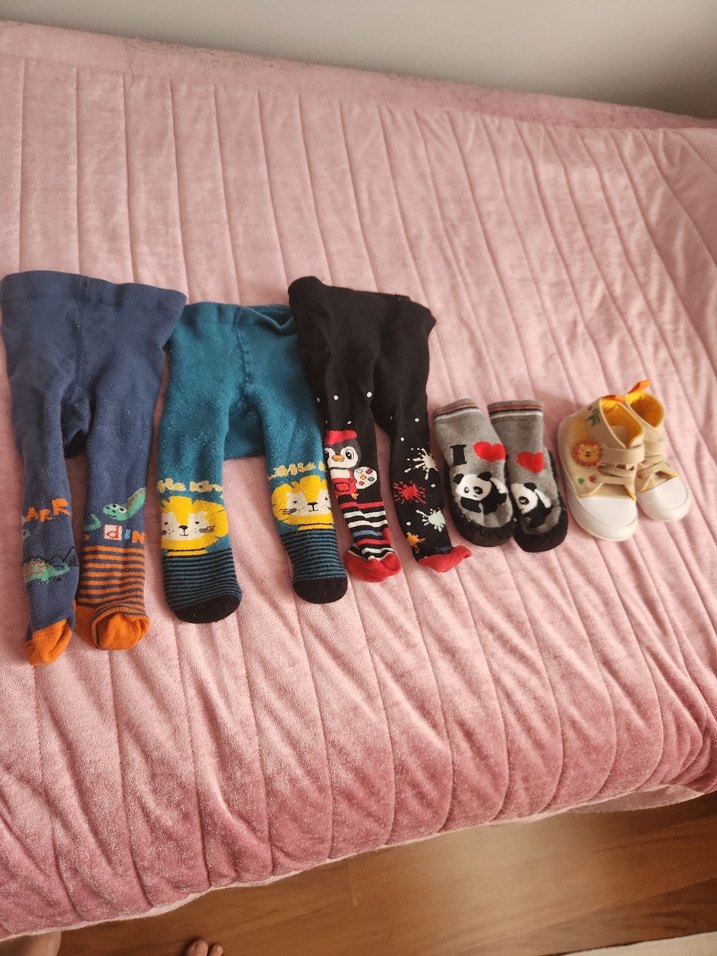 Çeşitli eğlenceli desenlere sahip renkli çocuk çorapları ve yumuşak kumaştan ayakkabı seti.
