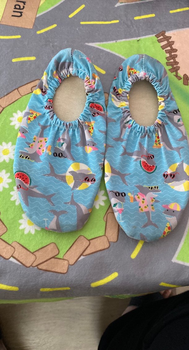 Yumuşak ve sıcak kumaştan, köpekbalığı ve karpuz desenli renkli çocuk denizde veya havuzda kullanılabilir ayakkabısı. Kolay kullanımı için lastikli açılış.