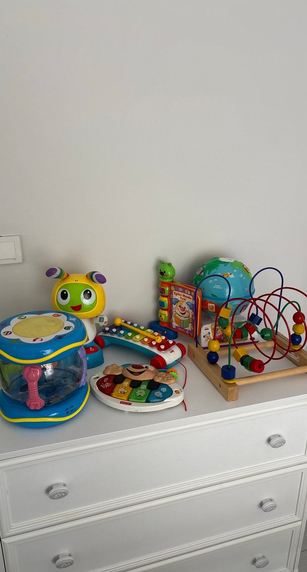 Çocuklar için müzikli klavye, boncuk labirenti, küre ve etkileşimli kitaplar içeren renkli eğitici oyuncak seti. Tek tek satılıktır