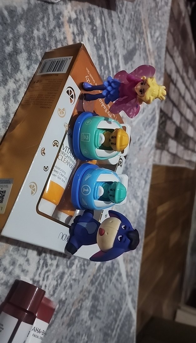Canlı renklerde çocuk figürleri ve mavi-yeşil küçük oyuncak araçlar içeren oyun seti.