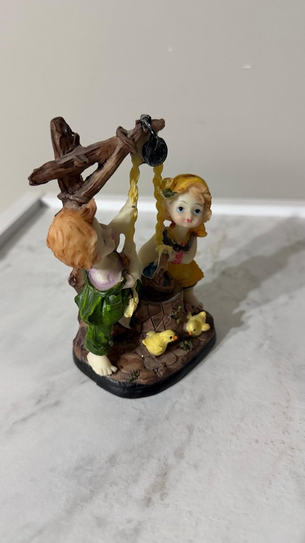İki çocuğun kuyu başında oynadığı, küçük hayvanların bulunduğu renkli ve detaylı figür.