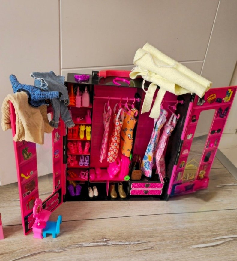 Pembe çerçeveli, çeşitli elbiseler, ayakkabılar ve aksesuarlar içeren renkli çocuk gardırop oyuncak seti. Askılı kıyafetler ve küçük mobilyalar bulunur. yalniz on kapağında renk atması var biraz..sorun yapmacaklar alsin..sonuçta oyuncak