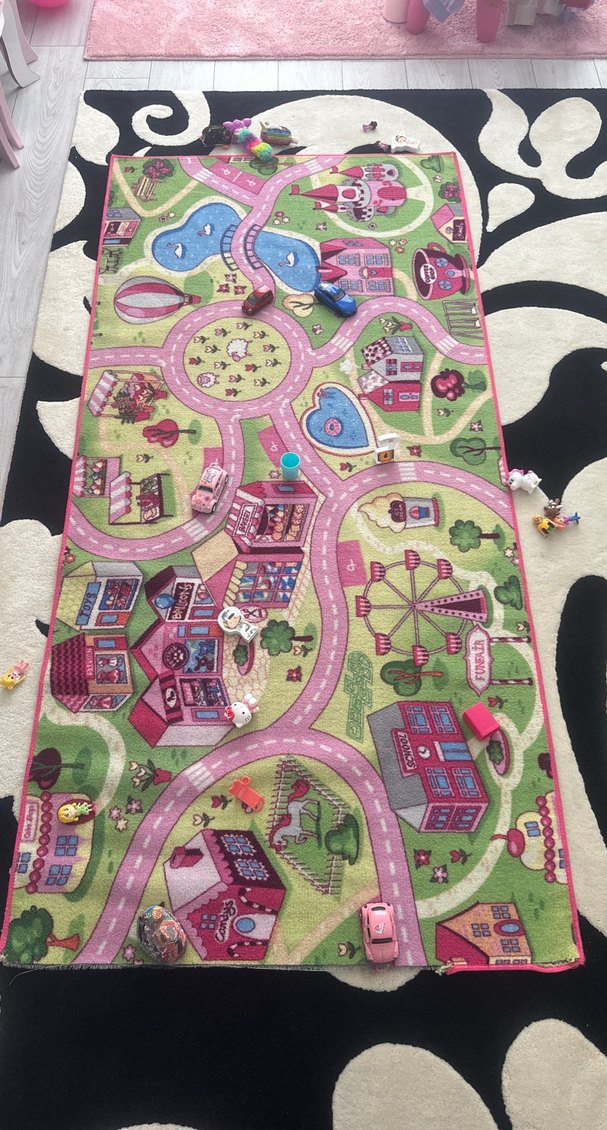 Eni 95 cm. Uzunluk ise: 200 cm. Oyun halısı yurtdışından alındı. Hala tertemiz hic bir kusuru yoktur. Altı kaydırmaz tabanlı. Kızlarım cok severek oynadılar. Hala satma diyorlar ama cok oyuncak ve kalabalık var. Bu sebebpten satıyorum. Başka çocuklar oynasın:) Baya uzundur. İncedir katlayarak kargoya veririm..Sadece tek taraf dikişi acıldı ama diktirilir. Onun dışında yırtık leke vs yoktur. Yıkayıp kaldırmıştım. Renkli çocuk halısı, şehir ve yol desenleriyle çeşitli binalar ve ağaçlar içerir. Çocuk odalarına neşeli bir hava katar. ️