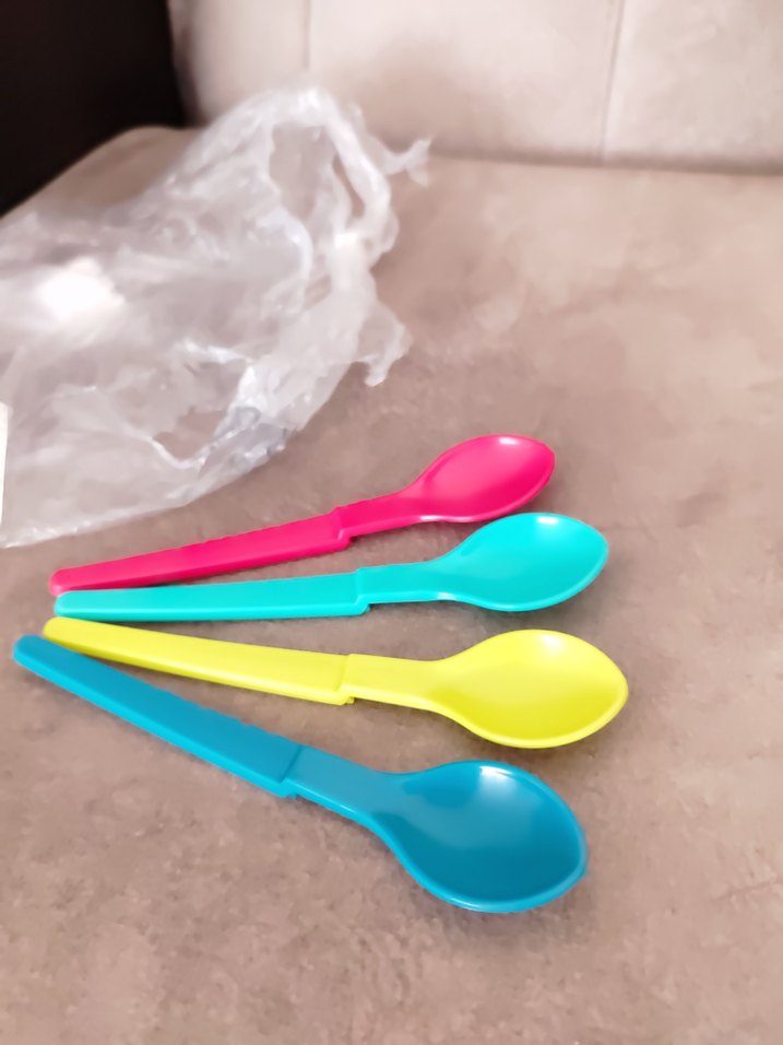Tapperware renkli plastik malzemeden yapılmış, pembe, mavi, sarı ve turkuaz renklerde çocuk kaşıkları seti. Hiç kullanılmadı.