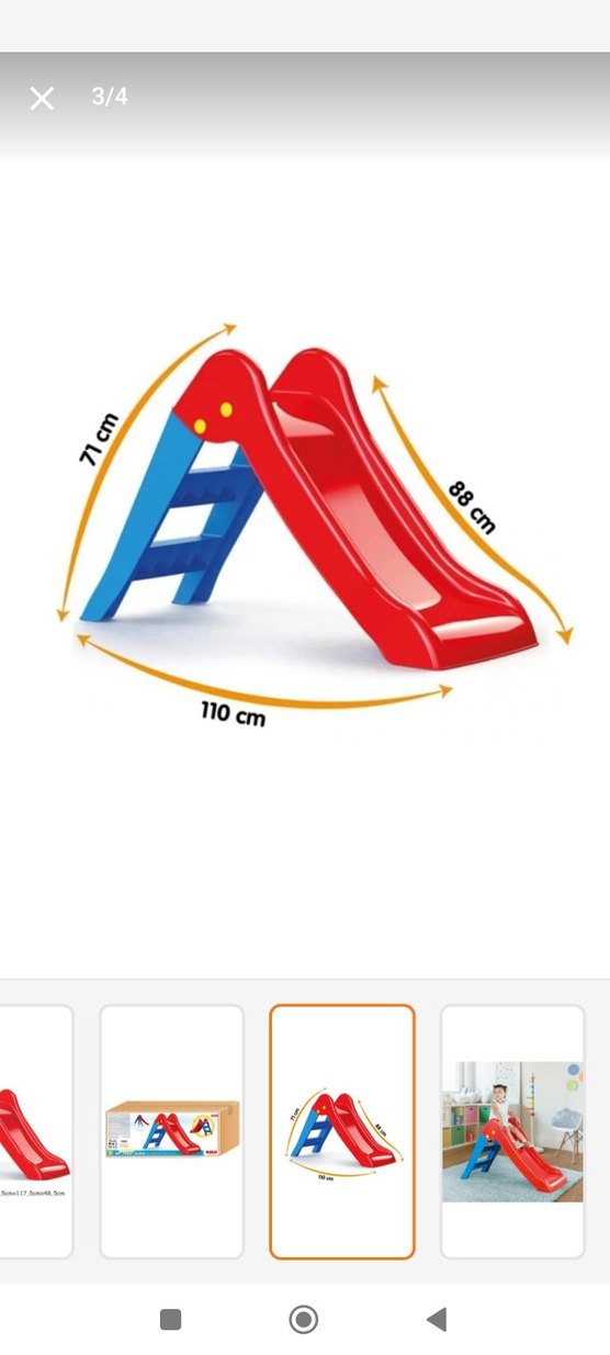 Renkli çocuk kaydırağı, kırmızı kaydırak ve mavi basamaklara sahiptir. Uzunluğu 110 cm olup çocuklar için eğlenceli ve güvenli bir oyun alanı sunar.