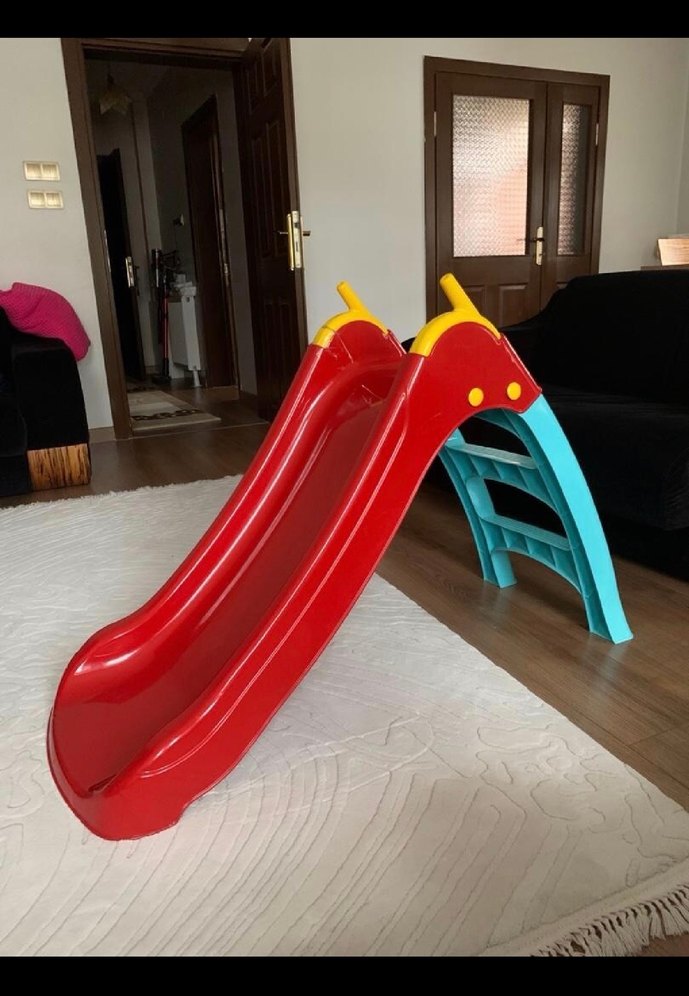 Kırmızı kaydırak yüzeyi, mavi basamaklar ve sarı tutacakları olan renkli çocuk kaydırağı, iç mekan oyunları için uygundur.