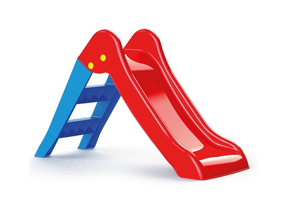 Renkli çocuk kaydırağı, kırmızı kayma yüzeyi ve mavi basamakları ile dayanıklı malzemeden üretilmiştir.