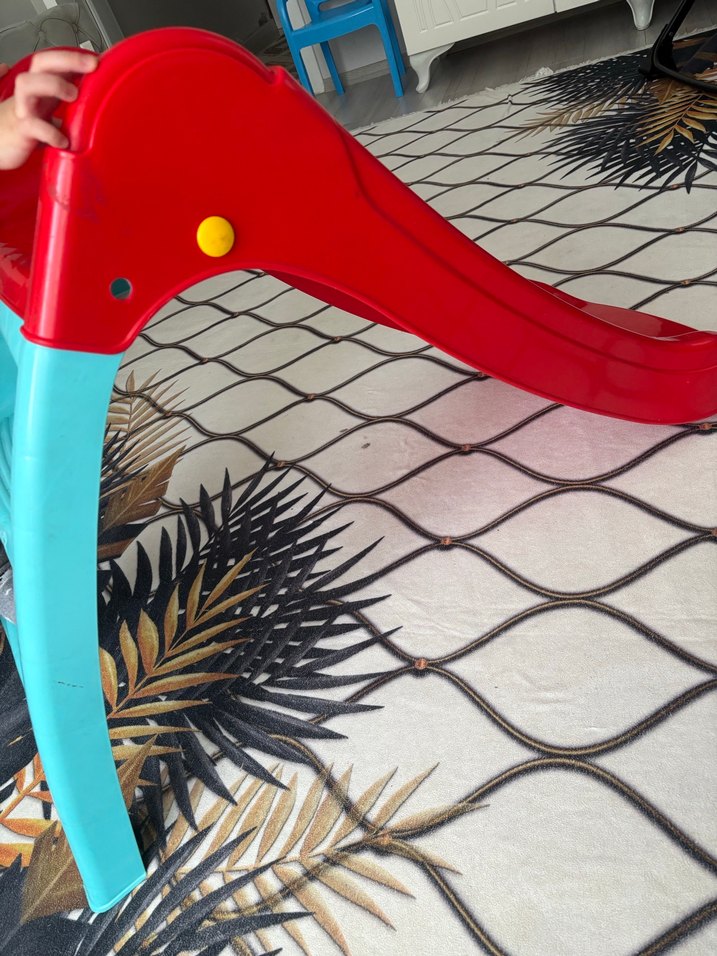 Renkli çocuk kaydırağı, kırmızı kayma yüzeyi ve mavi destek ayakları ile güvenli iç mekan oyununa uygundur.