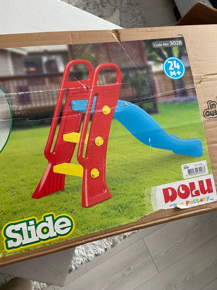 Renkli çocuk kaydırağı, kırmızı merdiven ve mavi kaydırak yüzeyiyle 24 ay ve üzeri çocuklar için uygundur. Güvenli ve eğlenceli oyun sunar.