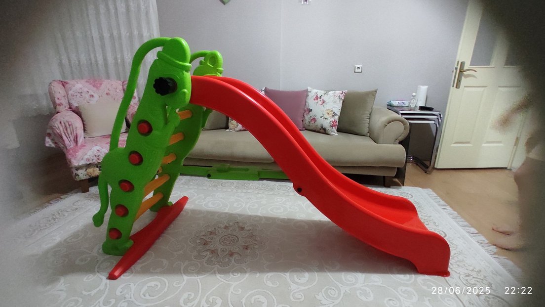 Çocuklar için tasarlanmış kırmızı kaydıraklı, yeşil tutacaklı renkli itmeli çekmeli oyuncak. Yaklaşık 185 cm uzunluğundadır.5 basamaklı