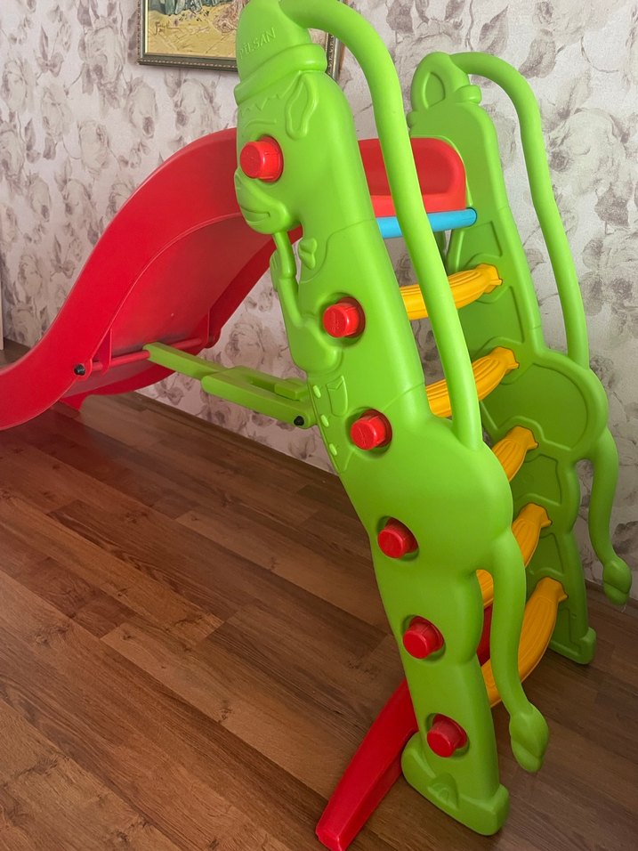 İç mekan için tasarlanmış, renkli çocuk kaydıraklı oyun eşyası. Dayanıklı tutacaklar ve tırmanma basamakları bulunur. tertemiz çok iyi durumda Pilsan markadır. Koyacak yerimiz olmadığı için uzun süredie evde dekoratif olarak duruyor.