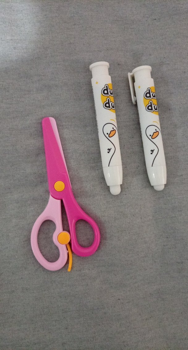 Renkli pembe çocuk makası ve çizgi karakterli iki adet silgi