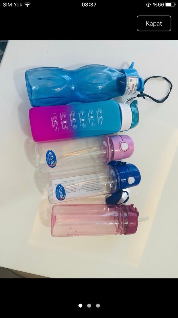 Çocuklar için çeşitli kapak ve tasarımlarda renkli matara ve suluk seti. 5 adet ikisi hiç kullanılmamıştır