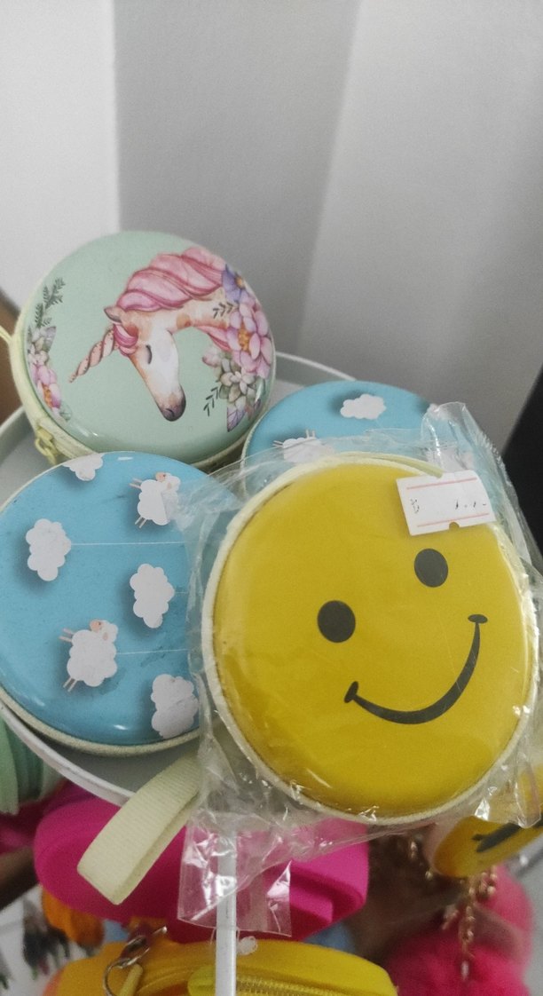 Unicorn, bulutlar ve gülümseyen yüz desenli renkli çocuk mini cüzdan seti. Küçük eşyalar için uygun. adet fiyatı