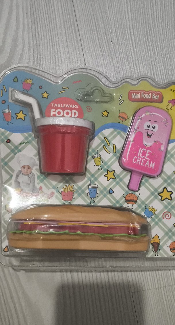 Renkli çocuk mini yemek seti, pembe dondurma, kırmızı pipetli içecek ve sandviçten oluşur.