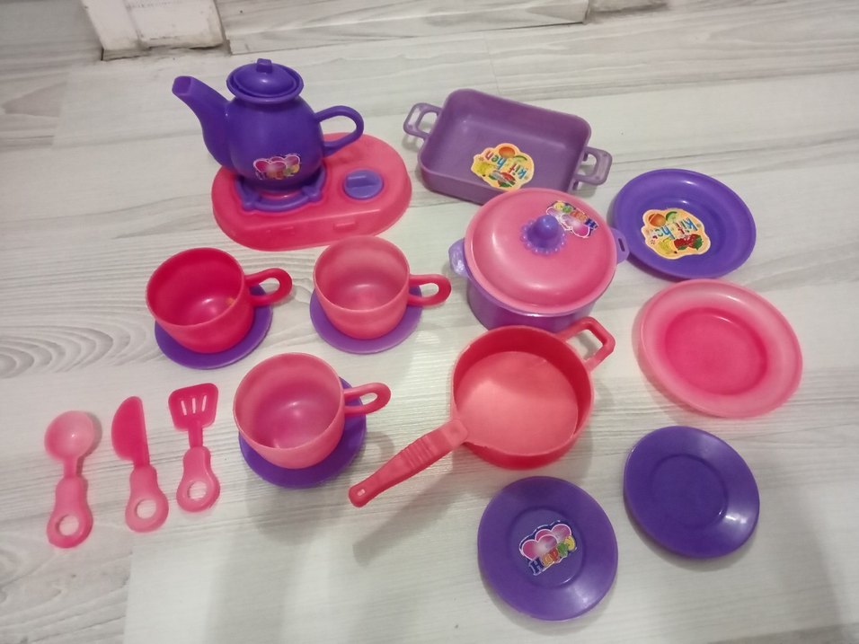 Pembe ve mor tonlarda tencere, tava, fincan ve tabaklardan oluşan renkli çocuk mutfak oyuncak seti.