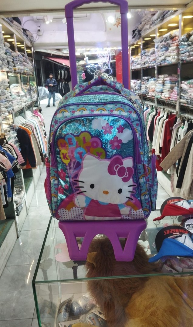 Çok bölmeli, renkli desenli çocuk okul çantası. Canlı ve eğlenceli tasarımıyla çocuklar için uygundur.