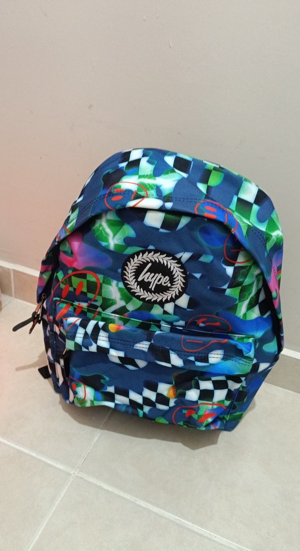 Canlı desenli ve ön cebinde 'hype' logosu bulunan renkli çocuk okul çantası. Okul için uygundur.