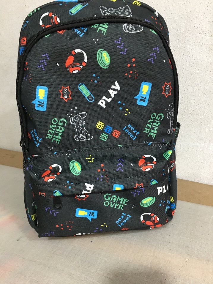 Oyun temalı renkli baskılara sahip, çok bölmeli çocuk okul çantası.