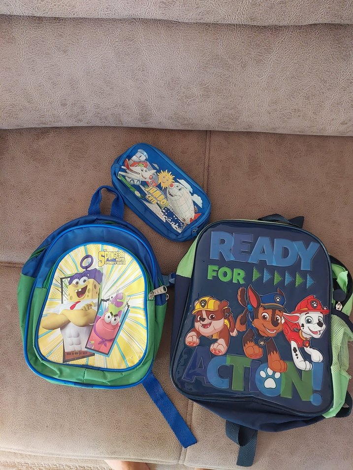 Popüler çizgi film karakterlerinin bulunduğu renkli çocuk okul çantaları ve kalemlik. Birinde Sünger Bob, diğerinde 'READY FOR ACTION' yazılı Paw Patrol var. ✏️