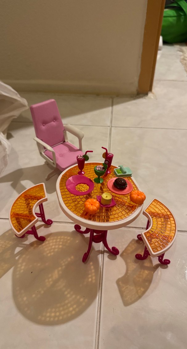 Pembe sandalye, yuvarlak masa ve küçük banklardan oluşan renkli çocuk oyun mobilyası seti, minyatür yiyecek ve içeceklerle hayal gücünü destekler. ️