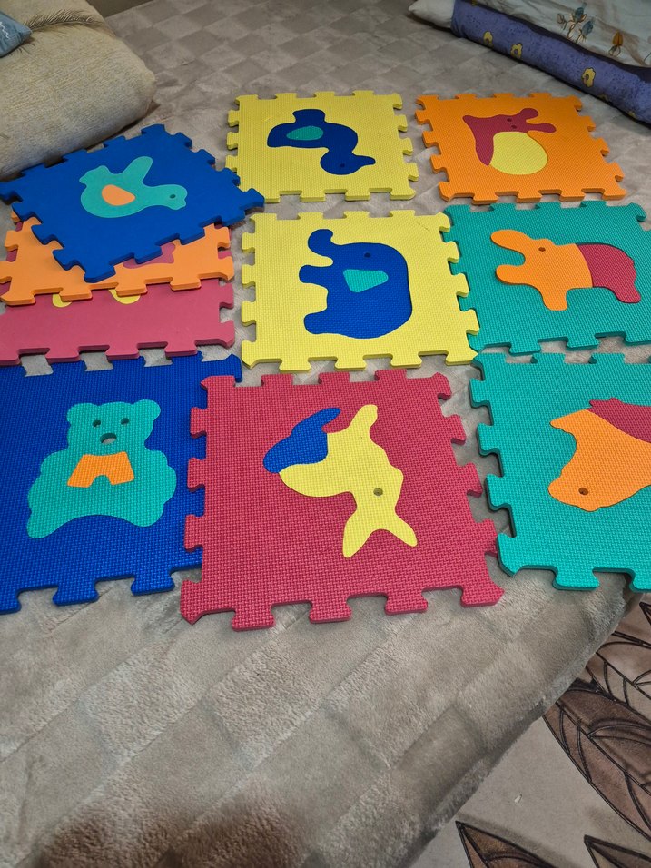Çocuklar için yumuşak ve sıcak malzemeden yapılmış, hayvan figürlü renkli oyun matı parçaları.