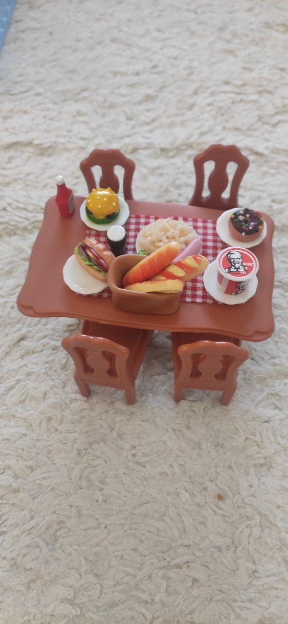 Renkli kahverengi çocuk oyun mobilyası seti, dört sandalye ve hamburger, ekmek, içecek gibi minyatür yiyecekler içerir.