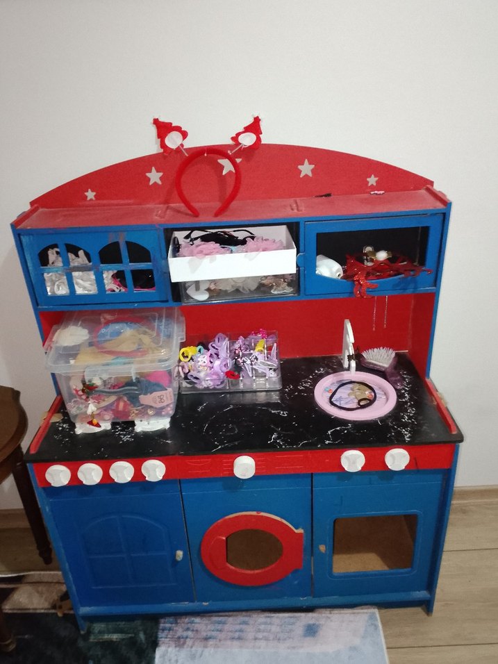 Mavi ve kırmızı renkte, çeşitli bölmeleri ve oyuncak aksesuarları bulunan renkli çocuk oyun mutfak seti.