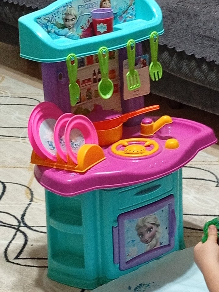 Renkli çocuk oyun mutfak seti, kaşık, çatal, tabak ve ocak detayları içerir. Frozen temalı görsellerle süslenmiştir.