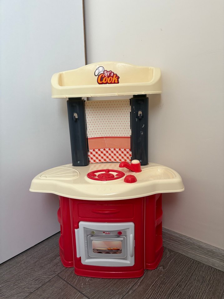 Renkli, sağlam plastikten yapılmış çocuk oyun mutfak seti. Ocak, fırın ve rafları içerir. Yaratıcı oyun için uygundur.
