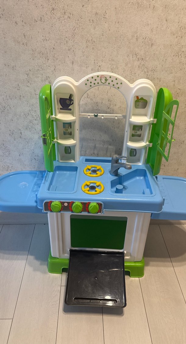 Yeşil ve mavi renkli çocuk oyun mutfağı, ocak gözleri, lavabo ve raflarla hayal gücünü destekler.