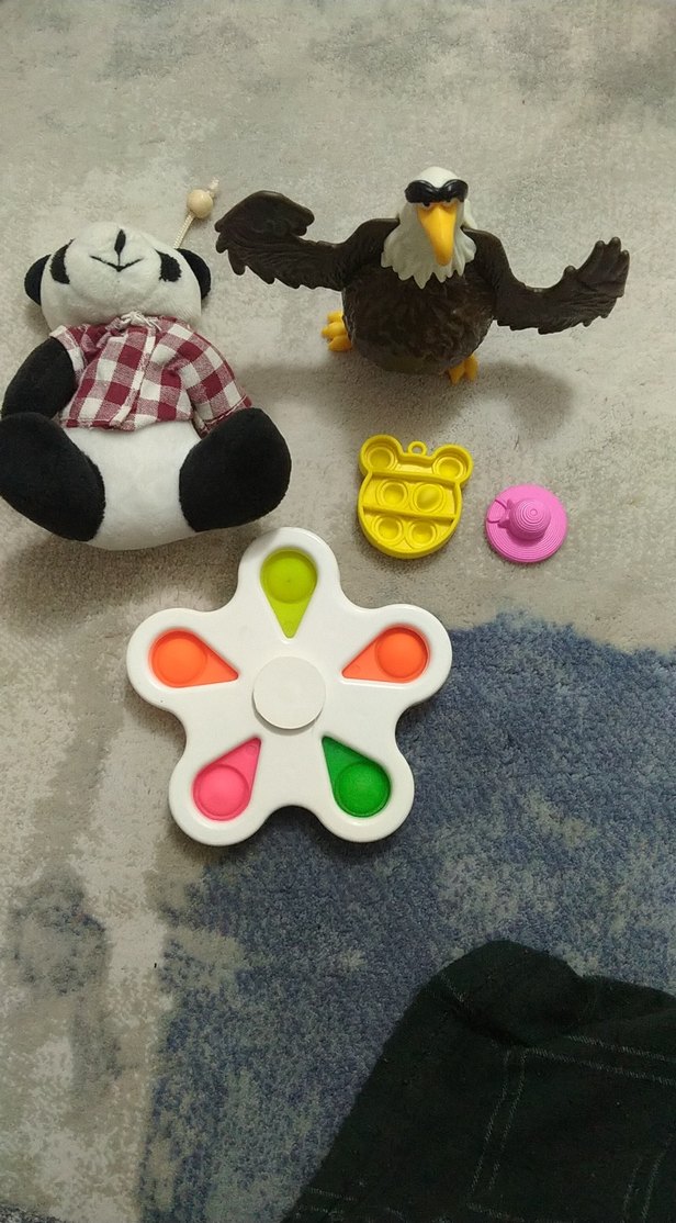 Peluş panda, kartal figürü ve çiçek şeklinde pop-it dahil renkli çocuk oyun seti.