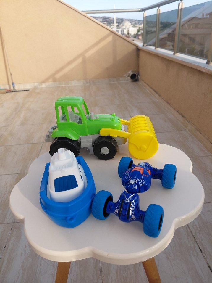 Yeşil traktör, mavi tekne ve mavi arazi arabasından oluşan renkli oyuncak araç seti.