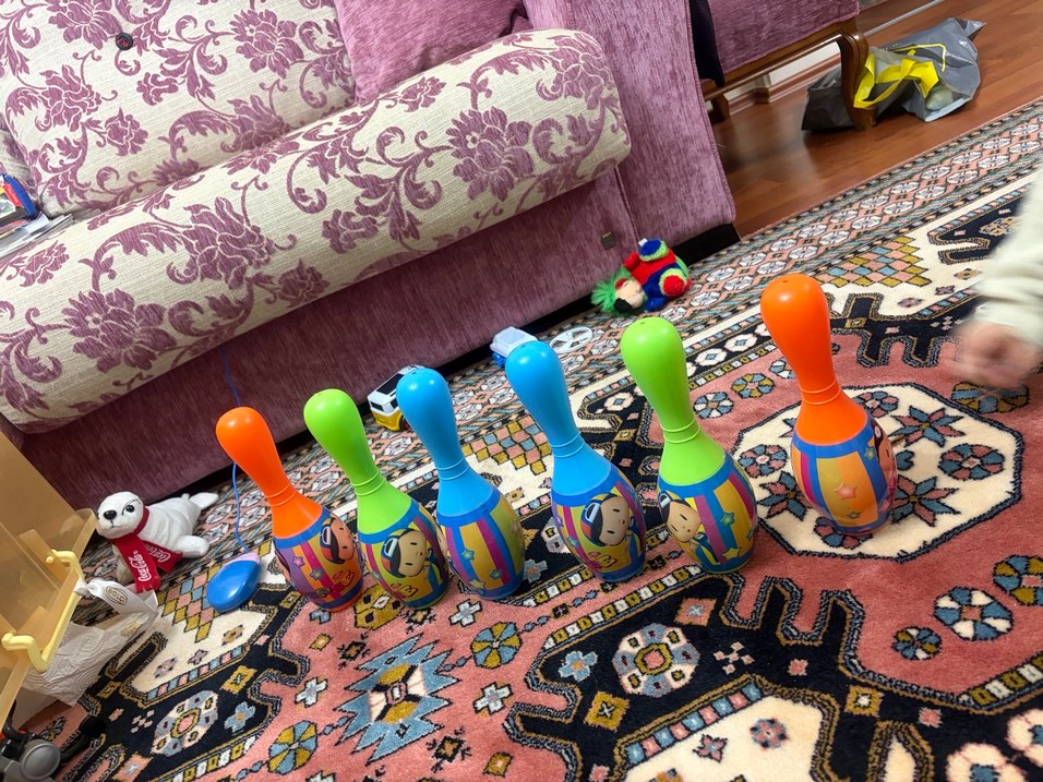 Renkli ve eğlenceli figürlü altı adet çocuk bowling pimi, iç mekan oyunları için uygundur.