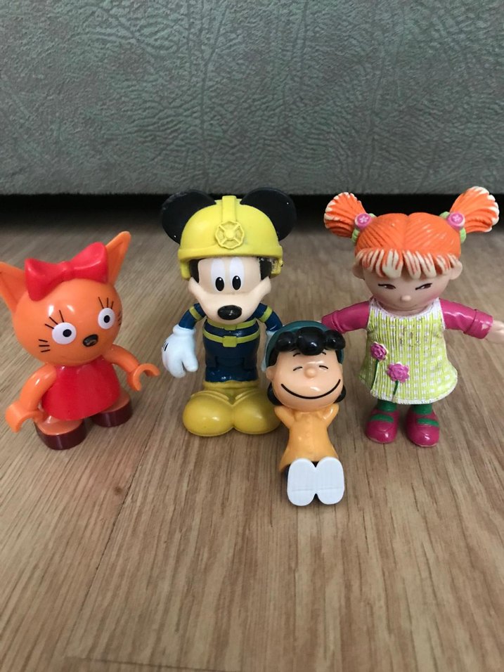 Sarı kasklı fare, turuncu saçlı kız, küçük turuncu kedi ve gülümseyen çocuk figürlerinden oluşan renkli oyuncak seti.