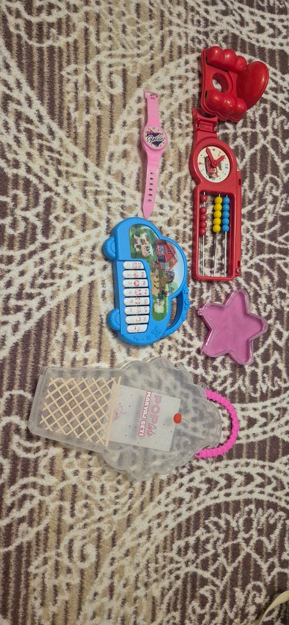 Oyuncak piyano, abaküs, saatler ve yıldız şeklinde bir eşyadan oluşan renkli çocuk oyuncak seti. piyano çalışır durumda pilli