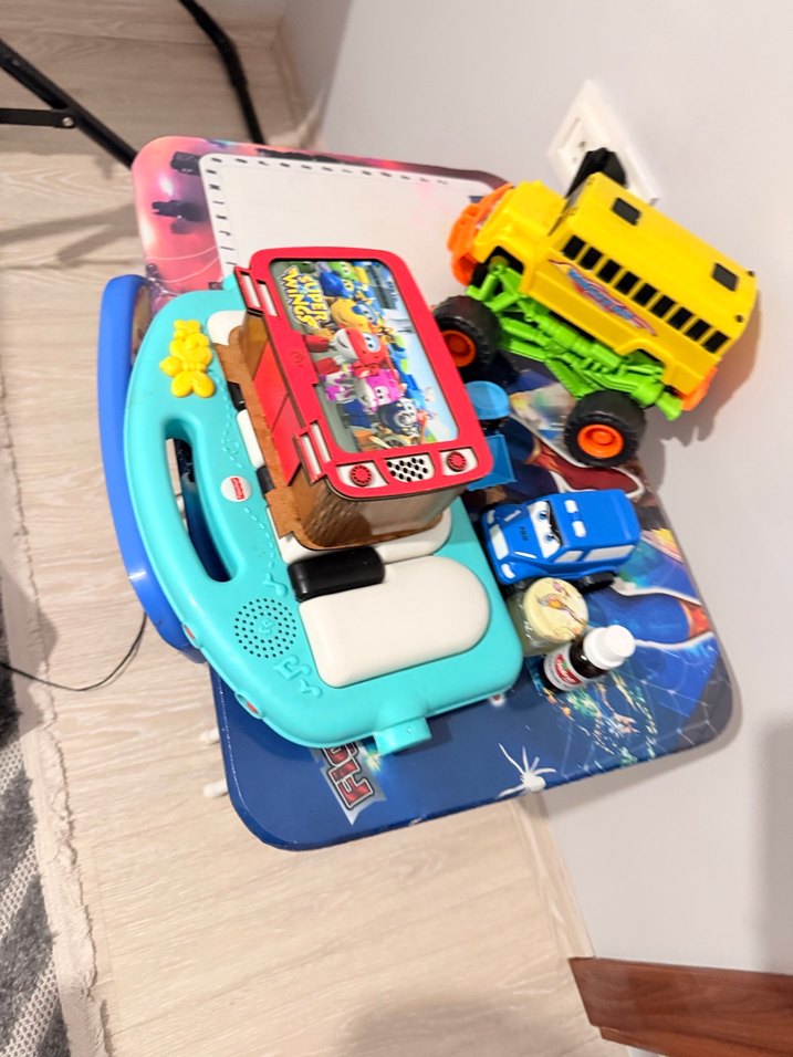 Piyano oyuncaklar sar ı oyuncak kamyon, mavi oyuncak araba ve butonlu, ekranlı etkileşimli öğrenme cihazı içeren renkli çocuk oyuncak set