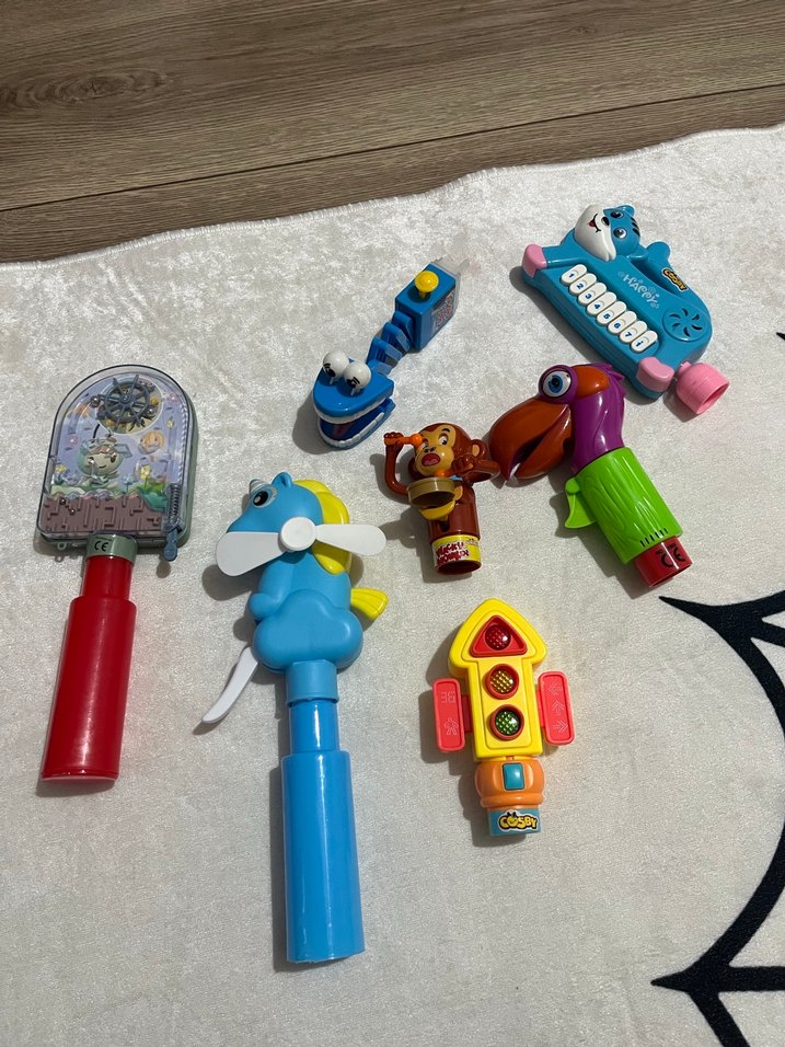 Xilofon, hayvan figürlü çıngıraklar ve etkileşimli el oyuncaklarından oluşan renkli çocuk oyuncak seti.