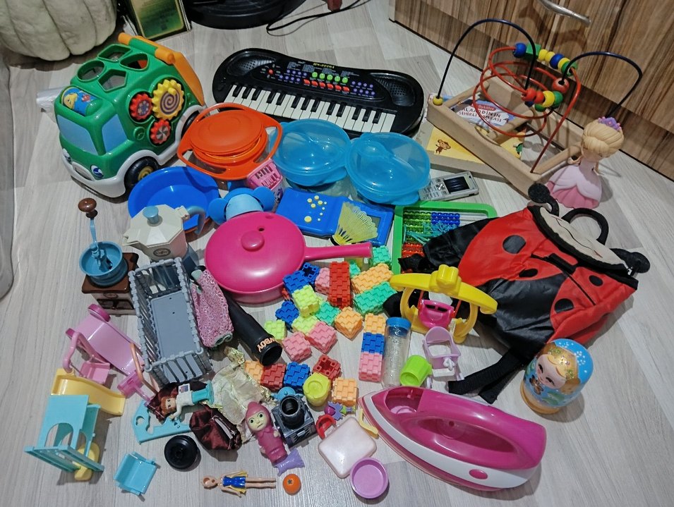 Oyuncak piyano, yapı blokları, mutfak gereçleri, bebekler ve çeşitli renkli oyuncaklardan oluşan çocuk seti.