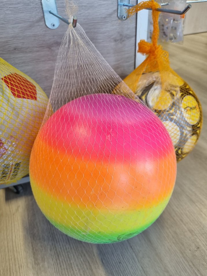 Yumuşak ve pürüzsüz malzemeden yapılmış, canlı çok renkli çizgileri olan renkli bir oyuncak top. Hafif ve oyun için uygun.